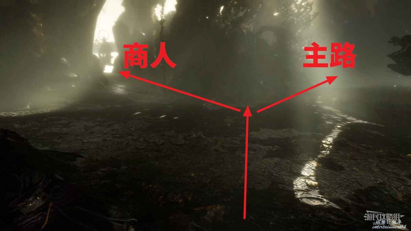 怪物位置前方是一個Y字路口,左側有個商人可購買武器【石杖】、【重菱刺】和符紋【振奮清除】。