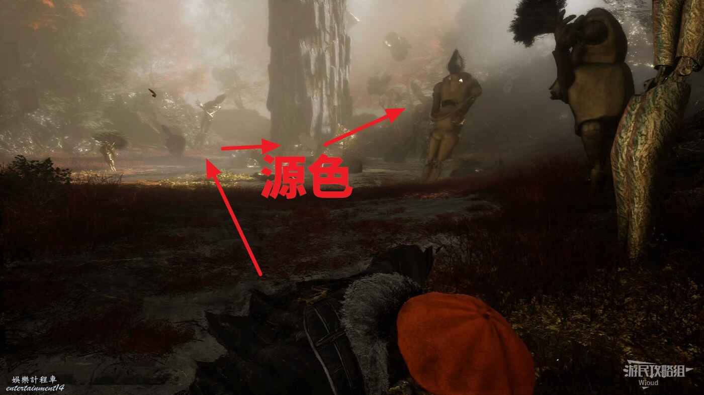 擊敗遊蕩的敵人,從左側繞到大石柱後面可撿一些源色,沿著右側的上坡上去,往右看。