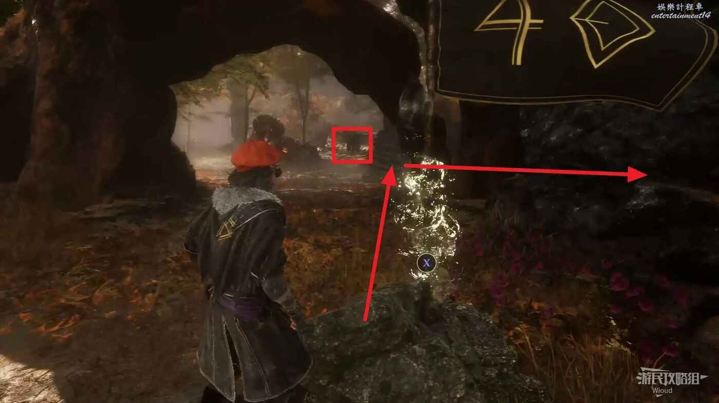 繼續沿路走到第一個旗幟的位置,然後與下圖紅框所示位置的暗影男孩對話觸發個劇情,這段劇情有判定,必須觸發!