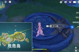 1.先來到危危島,如下圖,黃色箭頭指向,黑色圓圈這裡,點擊沉入水面,回到原來舊的危危島。 2.回到原來舊的危危島,這裡地形已經改變,來到水潭這裡,如下圖,用風元素點亮這裡的方碑,出現風場。通過風場飛到半山...