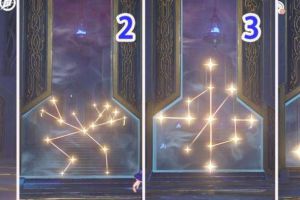 1.在星象儀附近一圈收集三個星象碎片 2.把這兩個碎片方入左下角的星盤上,屏障解除,進去第一個房間 3.按下圖所示完成解謎,解謎線索在天上 4.開啟寶箱,跟隨奇特的星星 5.進入水池,繼續跟隨星星的指引找到終點 6....