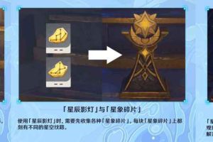 首先去找星象碎片 這邊有個調查點位和一個丘丘人 把碎片挖出來 之後傳送回秘境 開啟右邊的屏障 剛拿到的星象碎片 也就是第一個 放上面 下面放靠左的那一個 之後往前走 先觸碰此處 然後再跟隨星星 等它飛上去 可以看...