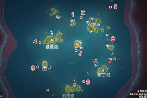 首先是總覽,這裡不用按照標註的順序來,因為跑完一個悠悠雲階後大幾率是離船很遠的,所以繼續下一個的時候就挑近一些的傳送點過去,重新召喚浪船就可以了。 △總覽 位置1 位於雙雙島西邊小島的岸邊。(雲階上還有一...