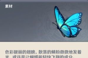 素材介紹 素材描寫:色彩靚麗的翅膀。散落的麟粉微微地發著光,或許是讓蝴蝶能輕快飛翔的成分。 刷新時間24小時 採集路線 1.望風角 2.低語森林 3.風起地 4.達達烏帕谷 5.清泉鎮 6.晨曦酒莊 7.輕策莊 8.靈矩關 9.翠綠...