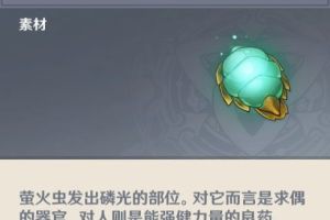 素材介紹 螢火蟲發出磷光的部位。對它而言是求偶的器官,對人則是能強健力量的良藥。 刷新時間24小時 採集螢火蟲獲得發光隨。 採集路線 1.望風角 2.清泉鎮 3.晨曦酒莊 4.輕策莊 5.青墟浦 6.天遒谷 7.奧藏山 8.奧藏山...