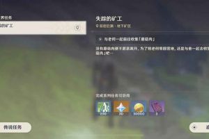 任務獎勵 30原石、250經驗、30000摩拉、3本紫色經驗書 任務流程 1、前往地上營地找到“沫寧”,他告訴我們有個礦工失蹤了,讓我們幫忙去找一下 2、前往地下如圖點位,找到一個叫“戚定”的人進行對話,告訴我們丟了一個...