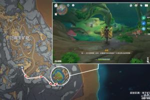 前往「倒懸之樹」所在的位置 按照下圖所示路線,沿著右手邊山側一路過去,即可到達解謎所在的區域。 如果有旅行者還是找不到的話,可以看一下我下面的實地場景截圖,首先來到巨淵主礦區南邊的傳送錨點,之後往東南方...